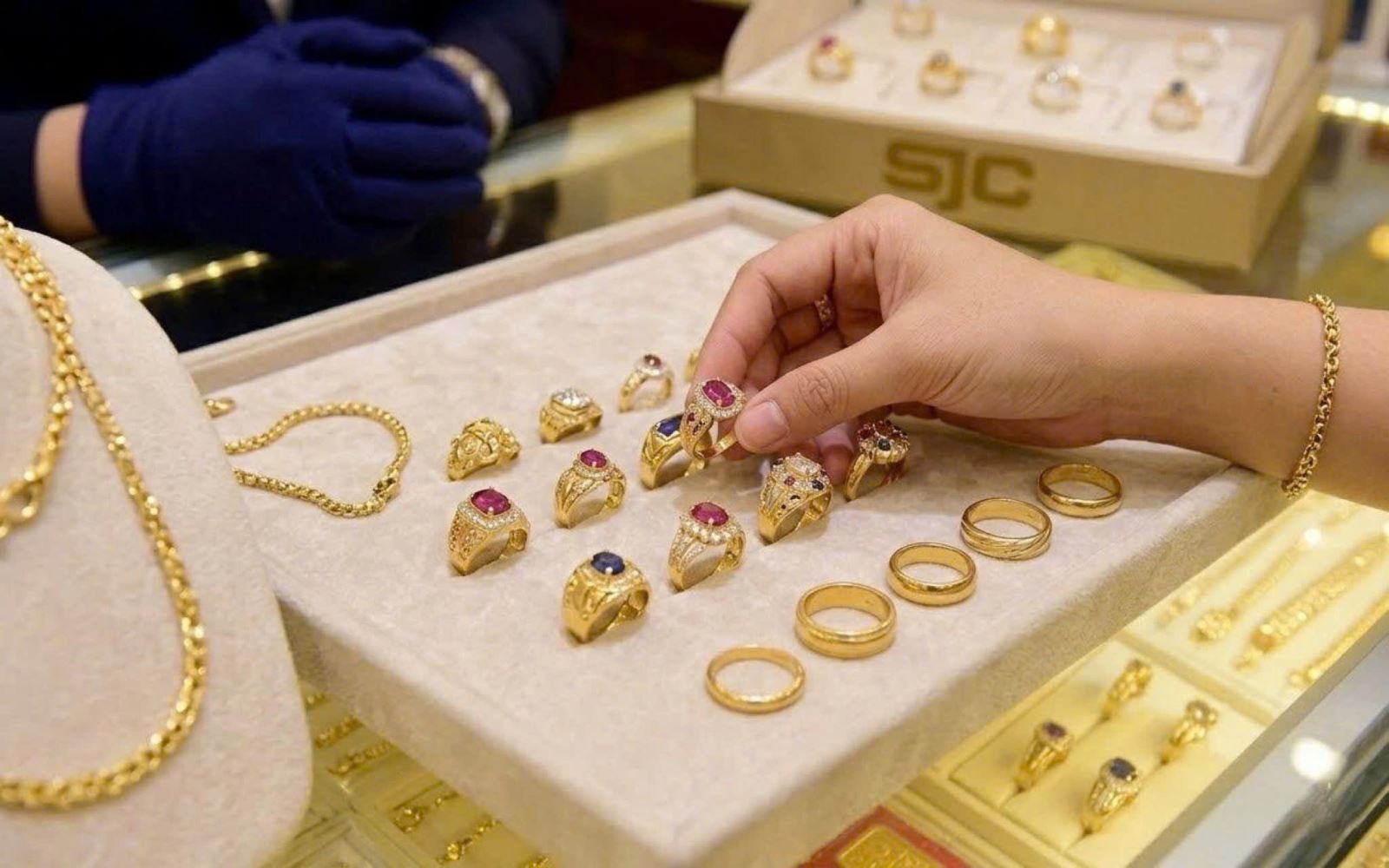 Đối với vàng trang sức, loại 99,99% được niêm yết khoảng 179,7 triệu đồng/lượng mua vào và 183,2 triệu đồng/lượng bán ra, trong khi vàng trang sức 99% ở mức 174,886 - 181,386 triệu đồng/lượng.
