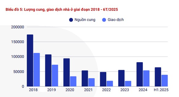 Lượng cung, giao dịch nhà ở giai đoạn 2018 - 6T/2025. Nguồn: VARS.