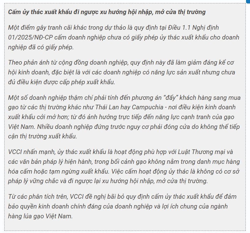 VCCI cho rằng quy định này làm gia tăng đáng kể rào cản gia nhập thị trường với doanh nghiệp mới. Khi chưa có hợp đồng xuất khẩu, yêu cầu phải nhập và dự trữ một lượng lớn gạo sẽ buộc doanh nghiệp phải huy động vốn lớn, chịu chi phí lưu kho, bảo quản - tạo gánh nặng tài chính không cần thiết. Bên cạnh đó, việc chưa xác định được thời điểm cấp giấy chứng nhận cũng khiến doanh nghiệp khó lên kế hoạch thu mua và tổ chức dự trữ.