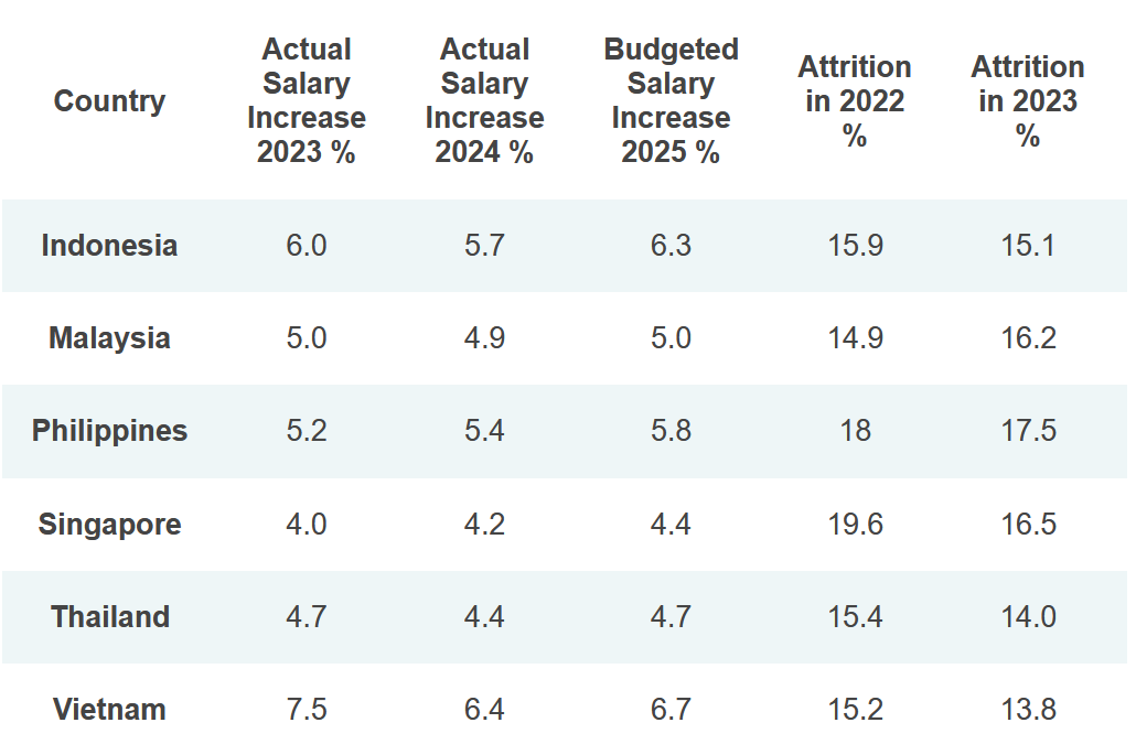Một nghiên cứu gần đây của Aon cho thấy quỹ lương tại các quốc gia Đông Nam Á tiếp tục tăng trong năm 2025, tuy tốc độ có sự khác biệt giữa các quốc gia. Chẳng hạn Việt Nam dự kiến dẫn đầu khu vực với mức tăng trung bình 6,7% trong năm 2025, tiếp đến là Indonesia (6,3%) và Philippines (5,8%). Trong khi đó Singapore chỉ tăng nhẹ 4,4%, bởi vì lương cơ bản ở đảo quốc sư tử vốn dĩ đã cao và thị trường lao động ngày càng cạnh tranh.
