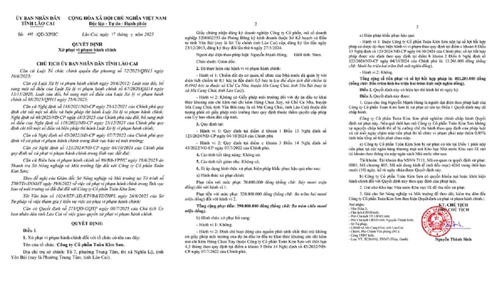 Cụ thể, theo quyết định xử phạt, Công ty Toàn Kim Sơn bị xử lý về 2 hành vi vi phạm: doanh nghiệp đã tự ý chiếm 0,4945 héc ta đất thuộc xã Chế Cu Nha, huyện Mù Cang Chải, tỉnh Yên Bái (nay là xã Mù Cang Chải, tỉnh Lào Cai) khi chưa được Nhà nước giao hoặc cho thuê. Với hành vi này, công ty bị phạt 70 triệu đồng.