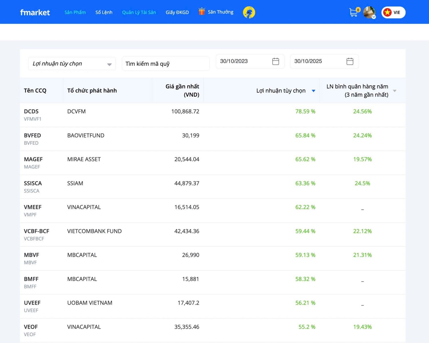 Xét từ đầu năm đến phiên 30/10, VN-Index dù trải qua các đợt điều chỉnh mạnh song vẫn duy trì mức tăng 31,8%, thống kê từ Fmarket cũng cho thấy nhiều CCQ có mức tăng trưởng trên 25% như BVFED, DCDS, MAGEF và BMFF.