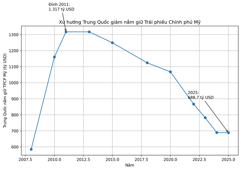 Theo dữ liệu mới nhất của Bộ Tài chính Mỹ, Trung Quốc lại ra tay, bán ra 11,8 tỷ USD trái phiếu kho bạc Mỹ. Nhát cắt này kéo quy mô nắm giữ của Trung Quốc xuống còn 688,7 tỷ USD, mức thấp nhất trong 17 năm kể từ cuộc khủng hoảng tài chính 2008. So với đỉnh lịch sử, kể từ khi từng nắm giữ hơn 1.300 tỷ USD trái phiếu Mỹ vào năm 2011, Trung Quốc đã giảm tổng cộng khoảng 611,3 tỷ USD, tương đương gần 47% lượng nắm giữ ban đầu.
