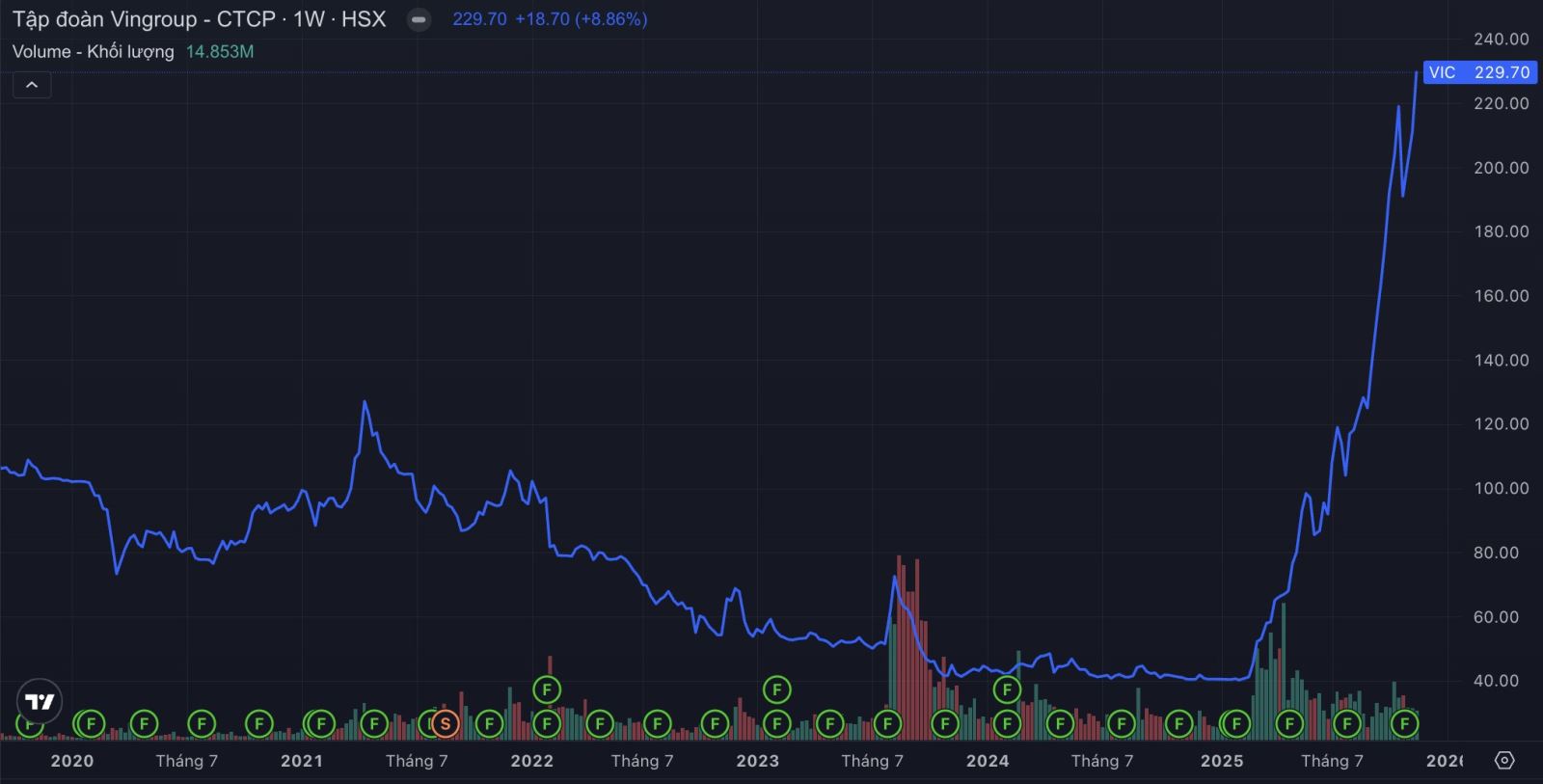 Cổ phiếu của Vingroup khép lại tuần giao dịch với 5 phiên tăng liên tiếp (gần 9%). Mã đóng cửa phiên 21/11 ở mức đỉnh lịch sử 229.700 đồng/cp. Vốn hóa của doanh nghiệp đạt trên 885.000 tỷ đồng. Đây là lần đầu tiên một doanh nghiệp Việt Nam có vốn hóa lớn tới như vậy.