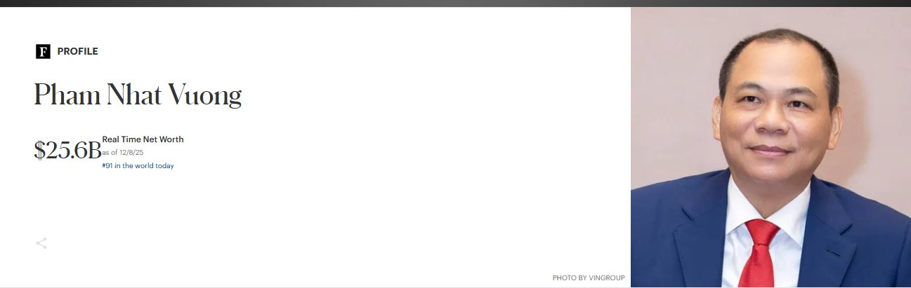 Biến động giá cổ phiếu VIC đã tác động đến thống kê tài sản của Chủ tịch Phạm Nhật Vượng. Dữ liệu thời gian thực từ Forbes ghi nhận tài sản của ông Vượng ở mức 25,6 tỷ USD, tăng 1,5 tỷ USD so với phiên trước.