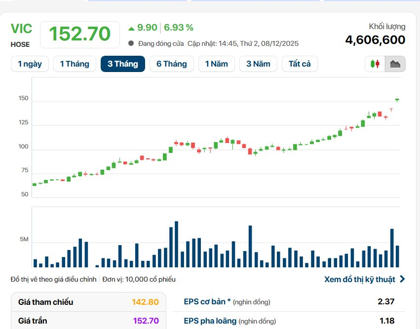 Kết thúc phiên giao dịch đầu tuần 8/12, cổ phiếu VIC của Tập đoàn Vingroup đóng cửa ở mức giá trần 152.700 đồng/cổ phiếu. Đây là phiên tăng trần thứ hai liên tiếp sau ngày chốt quyền nhận cổ phiếu thưởng tỷ lệ 1:1. Với mức giá này, vốn hóa thị trường của Vingroup đạt xấp xỉ 1,2 triệu tỷ đồng.