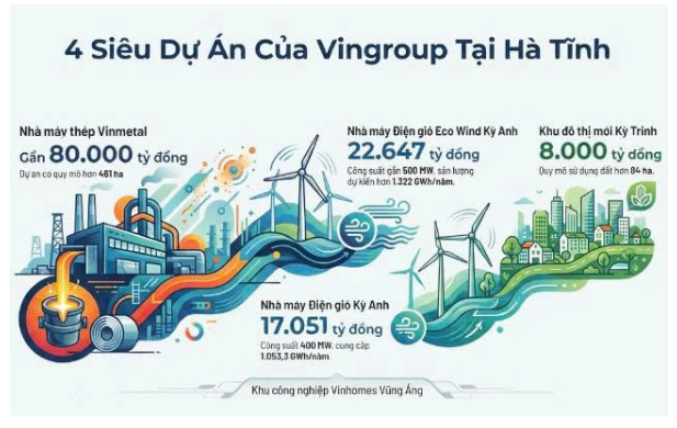 Các dự án bao gồm: Nhà máy sản xuất thép VinMetal Hà Tĩnh (quy mô 461 ha, tổng mức đầu tư gần 80.000 tỷ đồng); Nhà máy Điện gió Kỳ Anh (công suất 400 MW, vốn đầu tư 17.051 tỷ đồng); Nhà máy Điện gió Eco Wind Kỳ Anh (công suất gần 500 MW, vốn đầu tư 22.647 tỷ đồng) và Khu đô thị mới Kỳ Trinh (quy mô 84 ha, vốn đầu tư 8.000 tỷ đồng). Đây là các dự án nằm trong danh mục công trình chào mừng Đại hội đại biểu toàn quốc lần thứ XIV của Đảng.