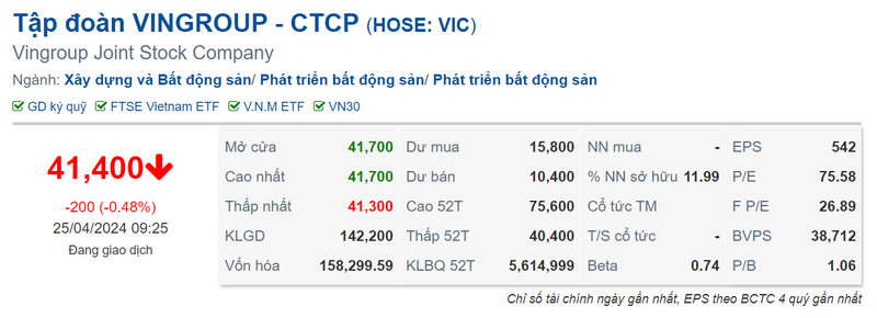 Trên thị trường chứng khoán, trong phiên sáng 25/4, cổ phiếu VIC giảm nhẹ 0.48% xuống mức 41.400 đồng/cổ phiếu.