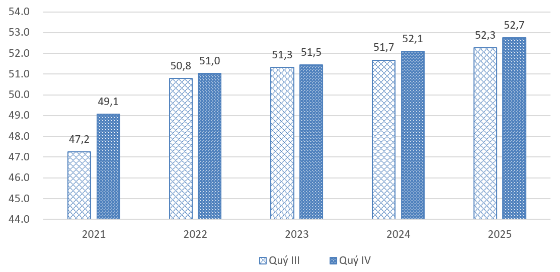Số liệu của Cục Thống kê (Bộ Tài chính) cho thấy, trong quý IV năm 2025, số lao động có việc làm trên cả nước đạt 52,7 triệu người, tăng 477,5 nghìn người so với quý trước và tăng 656,2 nghìn người so với cùng kỳ năm trước. Mức tăng tương ứng 0,9% so với quý III và 1,26% so với cùng kỳ cho thấy tốc độ tạo việc làm trong quý cuối năm đã được cải thiện rõ rệt, cao hơn so với nhiều năm trong giai đoạn 2021–2025, ngoại trừ năm 2021 chịu tác động đặc biệt của đại dịch Covid-19.