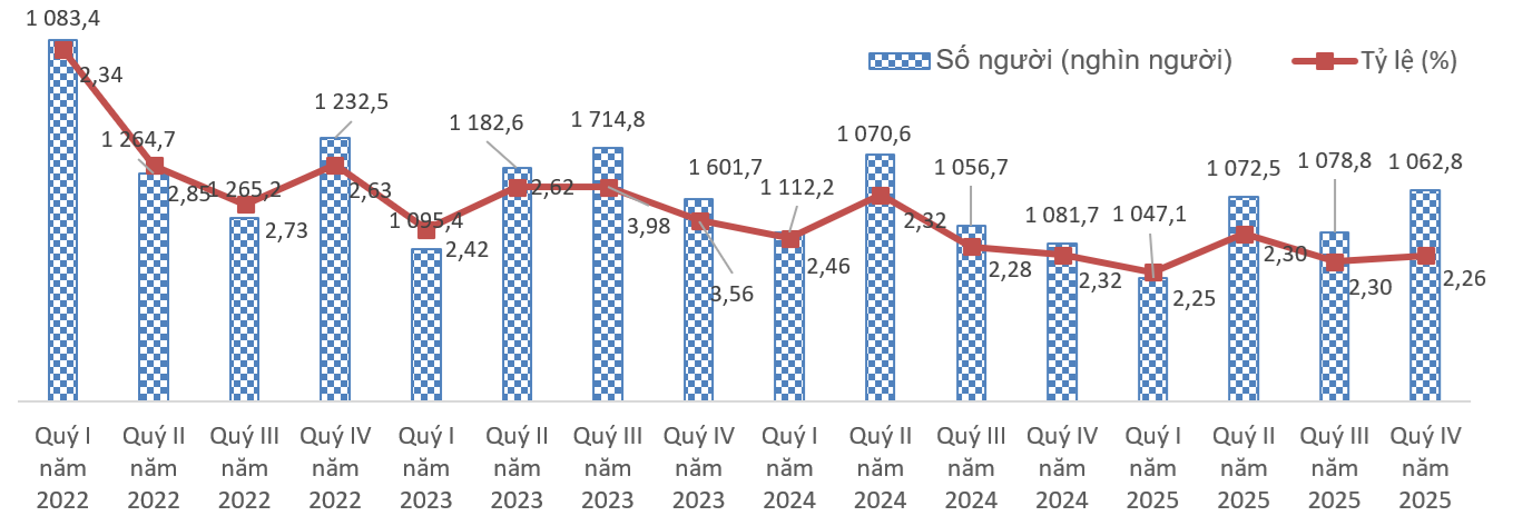 Song song với những tín hiệu tích cực về việc làm và thu nhập, tình hình thất nghiệp trong năm 2025 nhìn chung được kiểm soát ổn định. Trong quý IV năm 2025, số người thất nghiệp trong độ tuổi lao động khoảng 1,07 triệu người, tăng 13,1 nghìn người so với quý trước và tăng 16,7 nghìn người so với cùng kỳ năm trước. Tuy nhiên, tỷ lệ thất nghiệp trong độ tuổi lao động vẫn ở mức 2,22%, giảm nhẹ 0,01 điểm phần trăm so với quý trước và tương đương cùng kỳ năm trước.