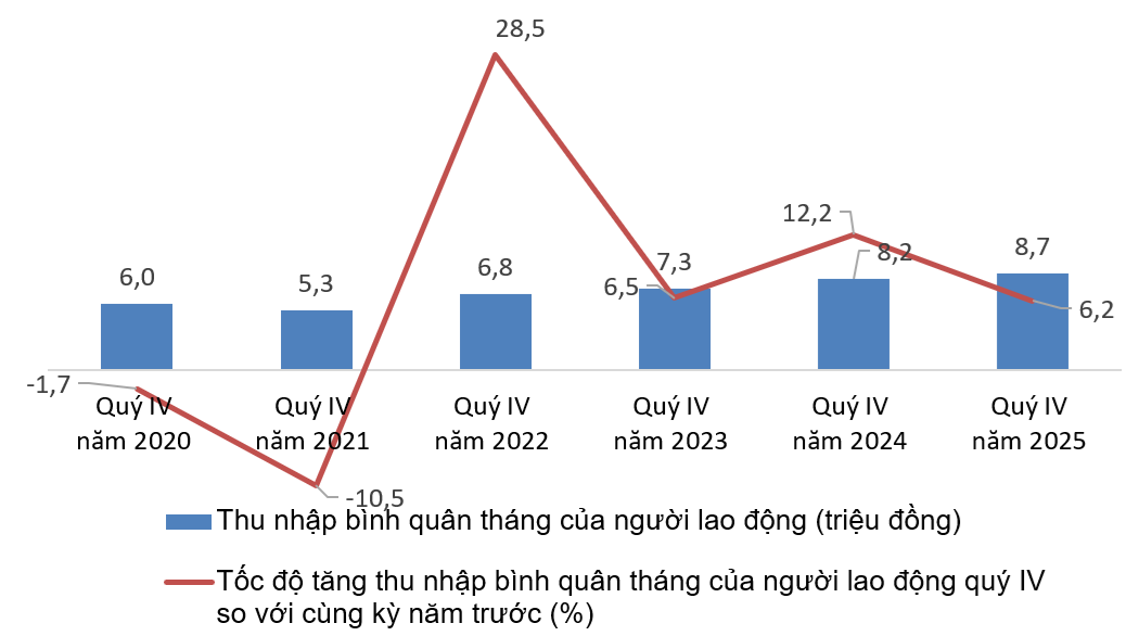 Cùng với sự gia tăng về số lượng việc làm, thu nhập của người lao động trong quý IV và cả năm 2025 cũng ghi nhận những cải thiện đáng kể. Theo Cục Thống kê, thu nhập bình quân tháng của người lao động trong quý IV năm 2025 đạt 8,7 triệu đồng, tăng 323 nghìn đồng so với quý trước, tương ứng tăng 3,9%, và tăng 508 nghìn đồng so với cùng kỳ năm trước, tương ứng tăng 6,2%.