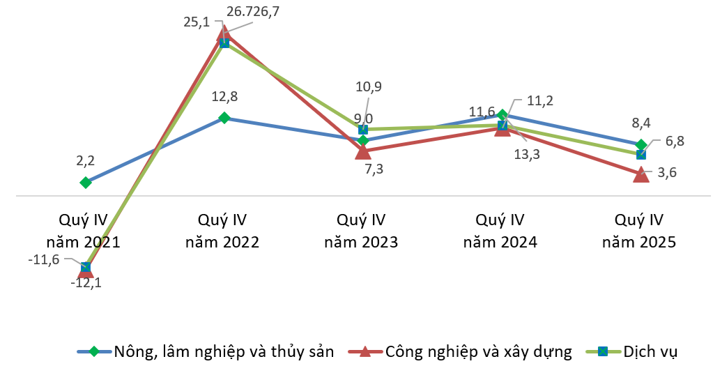 Xét theo khu vực kinh tế, thu nhập bình quân tháng của người lao động quý IV năm 2025 tăng ở cả ba khu vực. Lao động khu vực nông, lâm nghiệp và thủy sản có mức thu nhập bình quân 5,2 triệu đồng, tăng 7,5% so với quý trước và tăng 8,4% so với cùng kỳ năm trước – mức tăng cao nhất trong ba khu vực. Khu vực dịch vụ đạt 10,3 triệu đồng, tăng 4,0% so với quý trước và tăng 6,8% so với cùng kỳ. Khu vực công nghiệp và xây dựng đạt 9,3 triệu đồng, tăng 2,0% so với quý trước và tăng 3,6% so với cùng kỳ.