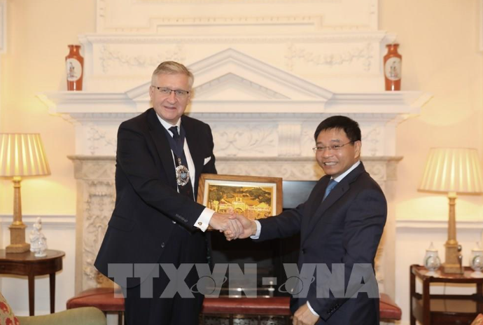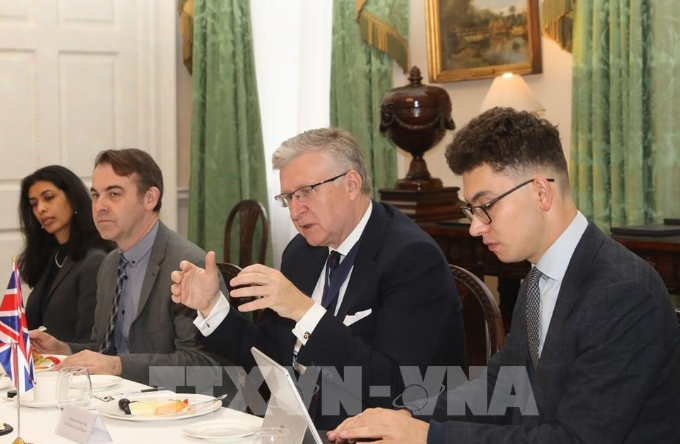 Thị trưởng Alastair King khẳng định Khu tài chính London sẵn sàng tư vấn, kết nối Việt Nam với các đối tác để đào tạo kỹ năng, phát triển nhân lực trong ngành tài chính. Ảnh: TTXVN phát.