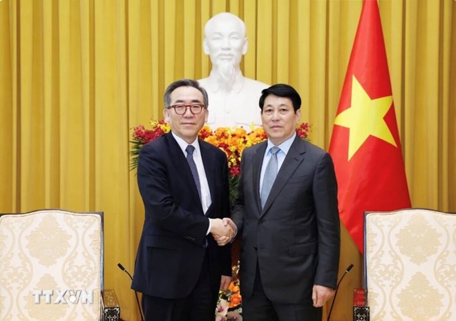 Ủy viên Bộ Chính trị, Chủ tịch nước Lương Cường tiếp Bộ trưởng Ngoại giao Hàn Quốc Cho Tae-yul. Ảnh: TTXVN
