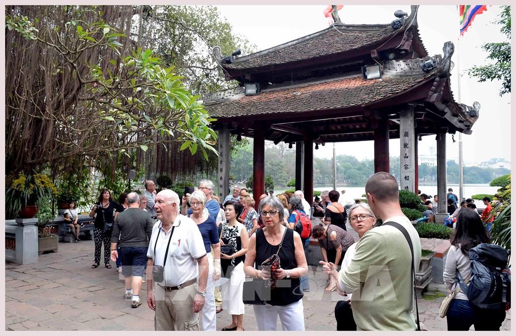 Trong ảnh: Khách du lịch quốc tế tham quan đền Ngọc Sơn (Hà Nội). Ảnh: Thanh Hà - TTXVN