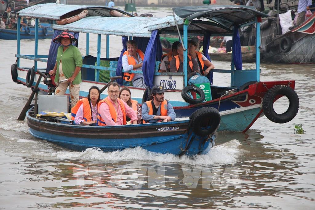 Du khách nước ngoài tham quan chợ nổi Cái Răng. Ảnh: Nguyễn Hằng - TTXVN