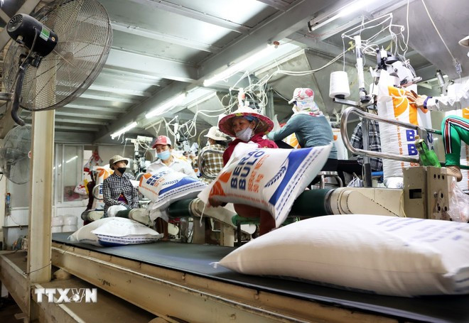 Dây chuyền đóng bao gạo xuất khẩu tại tỉnh An Giang. (Ảnh: Hồng Đạt/TTXVN)