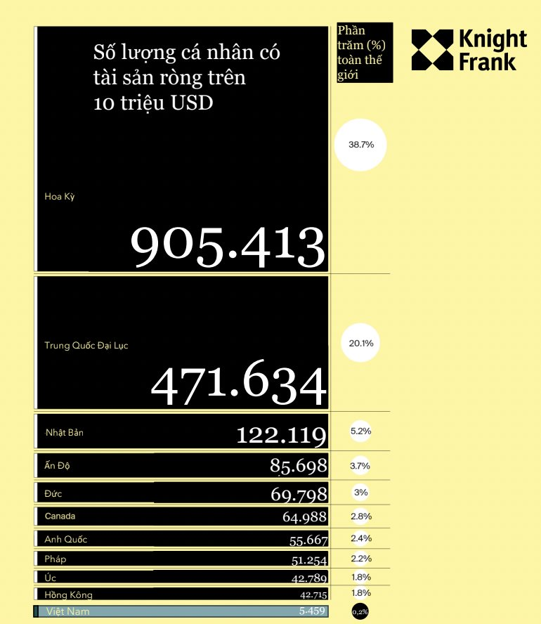 Theo ấn bản thứ 19 Báo cáo thịnh vượng toàn cầu - The Wealth Report năm 2025 – của Knight Frank, Việt Nam tiếp tục có những bước tiến trong bức tranh thịnh vượng, khi có tới 5.459 cá nhân sở hữu tài sản ròng trên 10 triệu USD, chiếm 0,2% tổng số cá nhân thượng lưu trên toàn cầu (năm 2024).