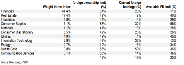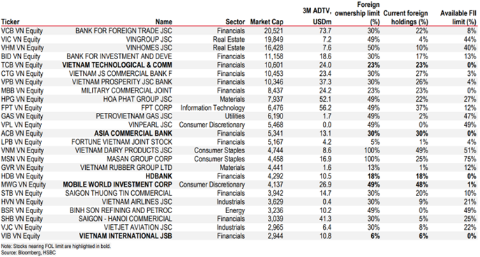 Một trong những quan ngại của FTSE là quy trình đăng ký phức tạp cho nhà đầu tư nước ngoài và giới hạn sở hữu nước ngoài (FOL) tại một số ngành. Ngành ngân hàng có mức trần 30%, còn hàng không và viễn thông là 50%.