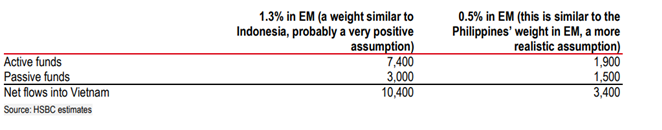 HSBC ước tính sau khi được nâng hạng, Việt Nam có thể chiếm khoảng 0.6% trong chỉ số FTSE Asia và 0.5% trong FTSE Emerging Markets. Điều này có thể thu hút khoảng 1.5 tỷ USD từ các quỹ thụ động, chủ yếu từ các quỹ FTSE EM và FTSE Global ex US.