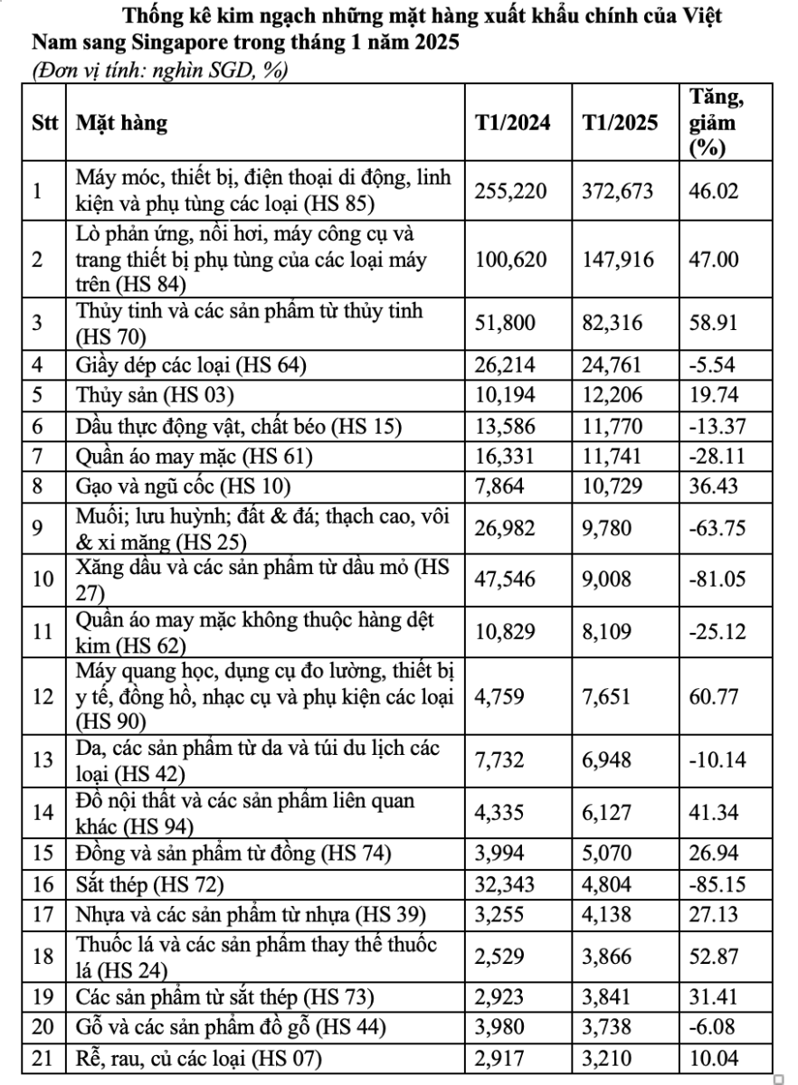 Về nhóm ngành hàng xuất khẩu từ Việt Nam sang Singapore, trong tháng 1, cả 3 nhóm hàng xuất khẩu chủ lực của Việt Nam tiếp tục tăng rất mạnh. Cụ thể, nhóm Máy móc, thiết bị, điện thoại di động, linh kiện và phụ tùng các loại tăng 46,02%; Lò phản ứng, nồi hơi, máy công cụ và trang thiết bị phụ tùng của các loại máy trên tăng 47%; Thủy tinh và các sản phẩm từ thủy tinh tăng 58,91%.