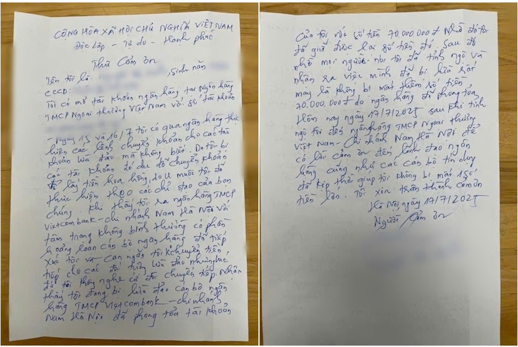 Trong bức thư viết tay, chị O. chia sẻ rằng mình bị dẫn dụ bởi các cuộc gọi mời chào "chuyển tiền để nhận hoa hồng", và các khoản tiền sẽ được hoàn trả dần kèm thêm lãi nếu tiếp tục chuyển thêm. May mắn thay, sự vào cuộc kịp thời của Vietcombank đã giúp chị không bị sập bẫy tội phạm công nghệ cao.