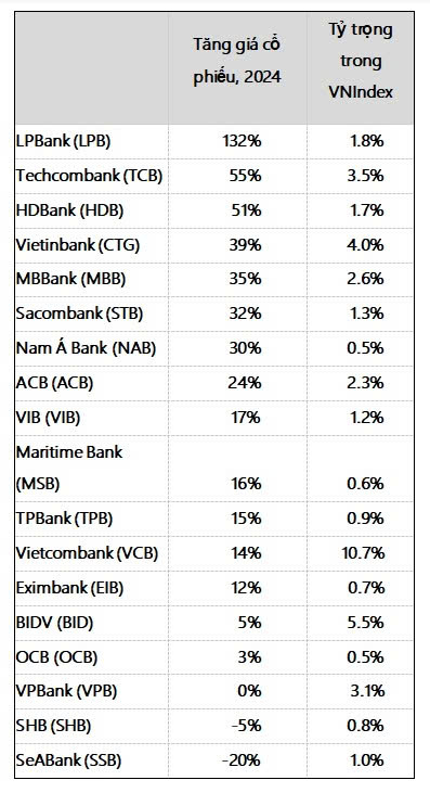 Theo VinaCapital, cổ phiếu ngân hàng chiếm tỷ trọng 40% trong VN-Index (VNI) và trong năm 2024 giá cổ phiếu ngân hàng đã tăng vượt trội so với VNI (18 ngân hàng niêm yết trên Sở Giao dịch Chứng khoán TP.HCM tăng 26% tính theo đồng nội tệ, so với VNI chỉ tăng 12%). VinaCapital tin rằng giá cổ phiếu ngành ngân hàng năm 2025 sẽ tiếp tục tăng tốt nhờ tăng trưởng lợi nhuận mạnh hơn (từ 14% năm ngoái lên 17% năm nay) nhất là khi các yếu tố thúc đẩy tăng trưởng GDP của Việt Nam dịch chuyển từ xuất khẩu và du lịch vào năm 2024 sang tiêu dùng, hạ tầng và bất động sản vào năm 2025.