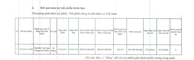 Cụ thể, ngày 27/12/2024, Vịnh Ngôi Sao tiến hành mua lại 2 lô trái phiếu VNSCH2125001 và VNSCH2126002 với tổng giá trị phát hành là 490 tỷ đồng. Tổng giá trị mua lại là hơn 502 tỷ đồng.