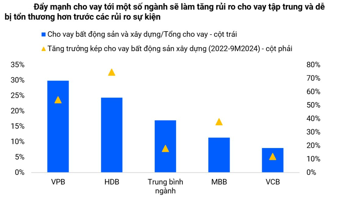 Theo chia sẻ của ban lãnh đạo, VPBank và HDBank có kế hoạch tăng cho vay ngành bất động sản trong 2025. Trong ba năm vừa qua, VPBank và HDBank đã ghi nhận tăng trưởng mạnh vào các ngành nghề có tính chu kỳ như bất động sản và xây dựng; với tổng dư nợ tăng trưởng bình quân hằng năm khoảng 60%/năm trong giai đoạn từ 2022 đến 9T2024, cao hơn đáng kể so với mức tăng trưởng của ngành là 18%.