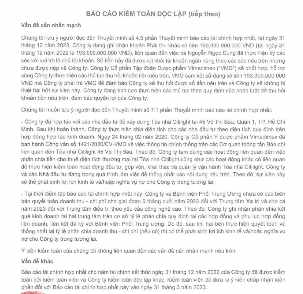 Bên cạnh đó, đơn vị kiểm toán còn lưu ý tới khả năng phát sinh lợi ích kinh tế và/hoặc nghĩa vụ nợ của Vimedimex trong tương lai. Vấn đề này có liên quan tới các hợp đồng của doanh nghiệp với các đối tác hợp tác đầu tư Toà nhà Citilight và Bệnh viện Phổi Trung ương.