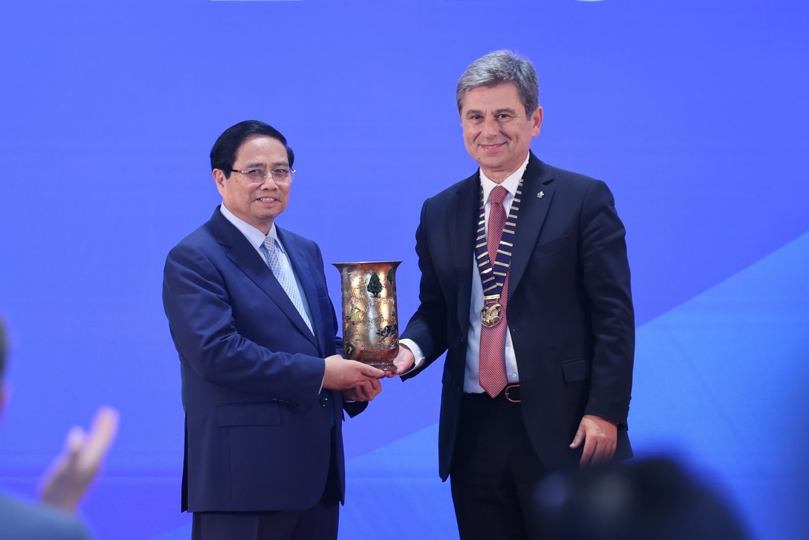 Ông Turgut Erkeskin, Chủ tịch FIATA tặng quà lưu niệm Thủ tướng Phạm Minh Chính. Ảnh: VGP