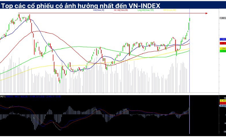 Đáng chú ý, dòng tiền không tập trung vào một nhóm cụ thể mà luân chuyển linh hoạt giữa ngân hàng, bất động sản, chứng khoán, bán lẻ và xây dựng. Sự phân bổ đều giúp thị trường tăng trong trạng thái bền vững, không phụ thuộc vào một vài trụ đỡ đơn lẻ. Trong phiên cuối tuần, khi VN-Index tiến gần 1.500 điểm, áp lực chốt lời đã xuất hiện rõ ràng. Tuy nhiên, các mã trụ như TCB và VHM tiếp tục nâng đỡ, mỗi mã đóng góp 1,85 điểm tăng cho chỉ số. Các cổ phiếu STB, MSN, VPB cũng hỗ trợ tích cực, trong khi VIC là lực cản lớn nhất, lấy đi 2,6 điểm.