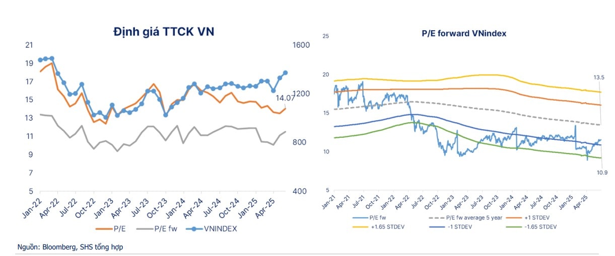 Theo SHS, đến cuối tháng 6, TTCK được xem là mức tương đối hấp dẫn nếu xét triển vọng tăng trưởng, quy mô GDP năm 2025 và 2026. Định giá P/E của
