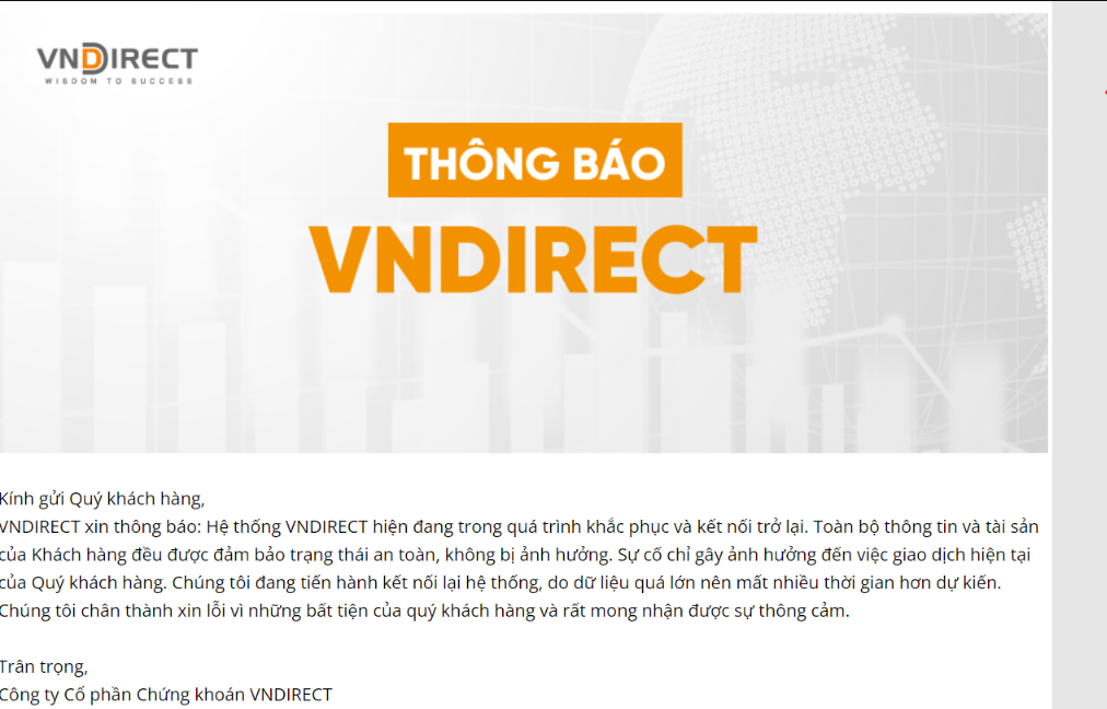 Đến phiên giao dịch chiều 26-3, hệ thống của Công ty CP Chứng khoán VNDIRECT (mã chứng khoán: VND) vẫn chưa thể truy cập. Doanh nghiệp này cho biết đang tiến hành kết nối lại hệ thống, do dữ liệu quá lớn nên mất nhiều thời gian hơn dự kiến.