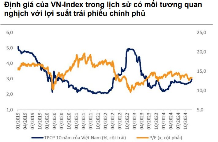 Bên cạnh tăng trưởng lợi nhuận tích cực, VNDirect nhận định P/E thị trường hiện tại khá hấp dẫn khi đang giao dịch với mức chiết khấu 8,2% so với trung bình 5 năm. Lợi suất trái phiếu chính phủ kỳ hạn 10 năm thường có mối quan hệ nghịch với hệ số P/E.