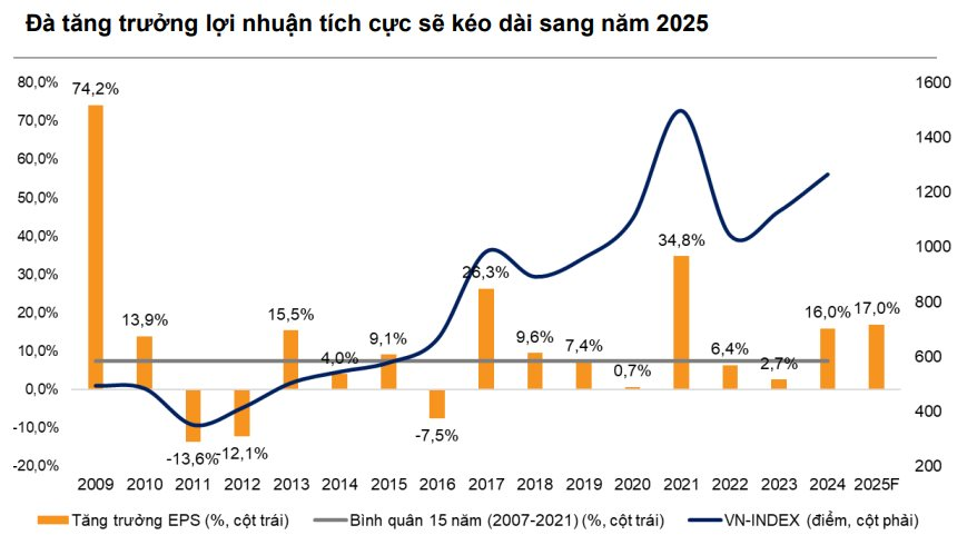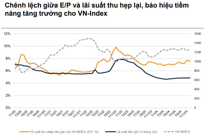 Đặc biệt, khoảng chênh lệch hiện tại giữa E/P (thu nhập/giá) và lãi suất tiết kiệm đang ở mức cao so với lịch sử, cho thấy sự hấp dẫn của kênh chứng khoán so với lãi suất tiết kiệm. E/P của VN-Index đạt 7,6% (ngày 27/12/2024), trong khi lãi suất tiền gửi kỳ hạn 12 tháng chỉ ở mức 4,9%/năm. Dự báo tăng trưởng lợi nhuận 17% của các doanh nghiệp niêm yết trên HOSE, kết hợp với môi trường lãi suất thấp, củng cố kỳ vọng về sự phục hồi của thị trường, được thúc đẩy bởi triển vọng tăng trưởng lợi nhuận mạnh mẽ trong năm 2025.