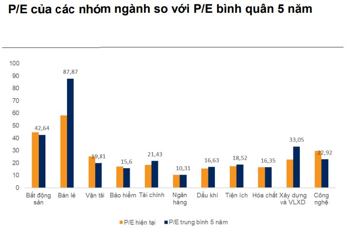 Về định giá các nhóm ngành, P/E của ngành Bán lẻ hiện đang giao dịch thấp hơn đáng kể so với mức trung bình 5 năm là 87,87 lần. Cùng với triển vọng tăng trưởng chậm hơn dự báo cho năm 2025, thị trường đã có xu hướng thận trọng hơn đối với ngành này.