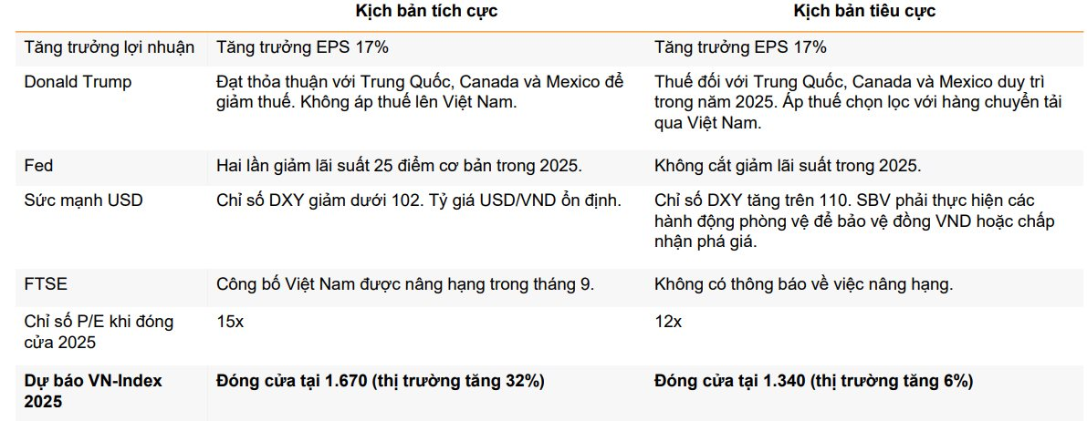 Đưa ra hai kịch bản cho thị trường năm 2025, VNDirect cho rằng trường hợp tích cực khi tăng trưởng EPS đạt 17% với P/E 15x, Fed có hai đợt giảm lãi suất 25 điểm cơ bản, tỷ giá USD/VND duy trì ổn định và FTSE công bố Việt Nam được nâng hạng trong tháng 9, VN-Index có thể đóng cửa năm 2025 tại mốc 1.670 điểm, tương đương mức tăng 32%. Ngược lại trong kịch bản tiêu cực, chỉ số chỉ đóng cửa năm với mức tăng khiên tốn 6% tại 1.340 điểm.