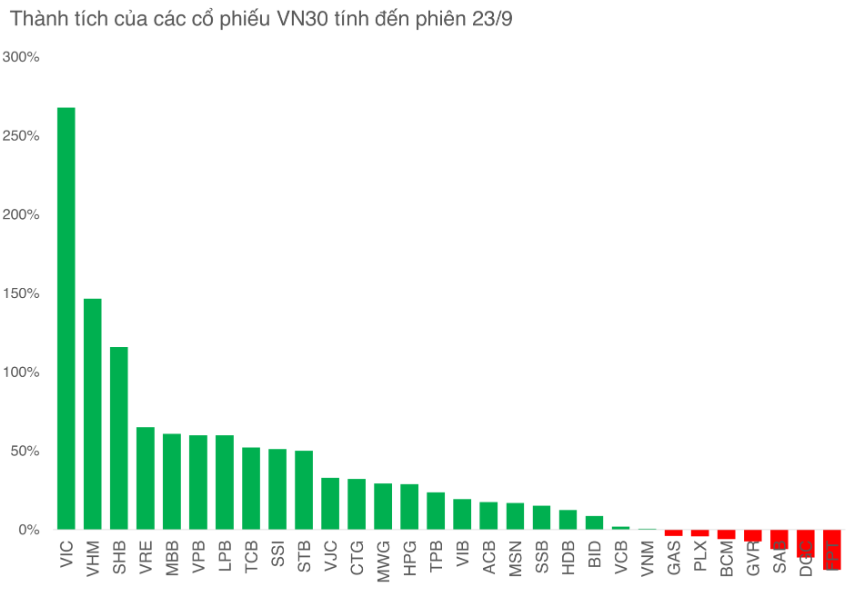 Trong nhóm VN30, chỉ còn 6 cổ phiếu duy trì được xu hướng tăng ngắn hạn tính đến hết phiên giao dịch 23/9: VIC, LPB, MWG, HPG, STB và VNM. Trong đó, VIC gây chú ý khi đã tăng tới 268% từ đầu năm, LPB tăng 60%, STB tăng 50,1%, MWG và HPG đều quanh mức 29%. Riêng VNM gần như chưa có thành tích nổi bật so với đầu năm, nhưng vẫn nằm trong số ít mã giữ được xu hướng tăng.