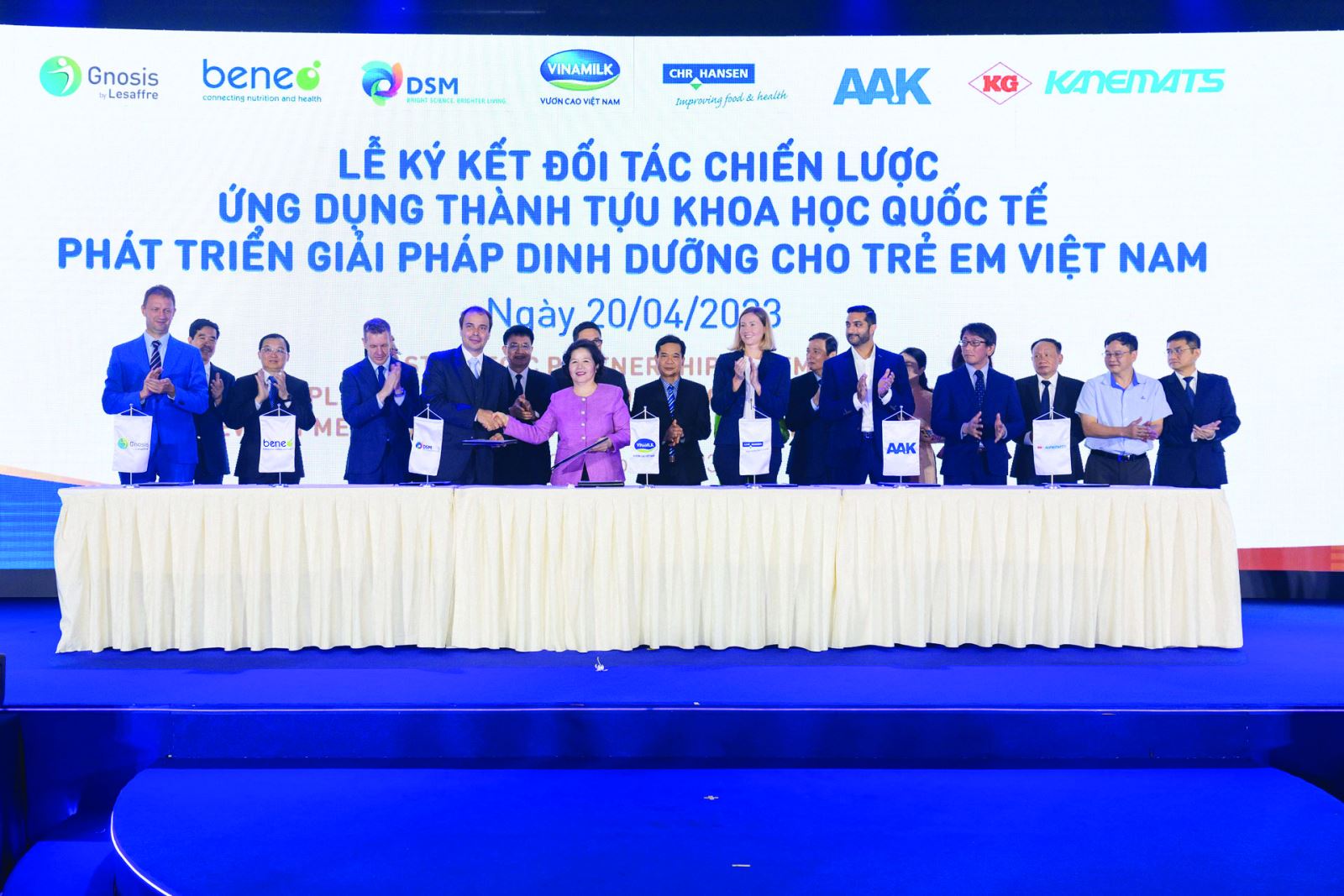 Điển hình là sự kiện ký kết đối tác chiến lược với 6 tập đoàn dinh dưỡng quốc tế hàng đầu vào tháng 4/2023. Hợp tác này giúp Vinamilk có thể tiếp cận với các thành tựu khoa học dinh dưỡng mới nhất trên thế giới, để ứng dụng vào các dòng sản phẩm sữa bột trẻ em đạt chuẩn quốc tế và tiến gần tới chuẩn vàng sữa mẹ. Đây cũng là lần đầu tiên có đến 6 tập đoàn dinh dưỡng quốc tế cùng có mặt tại Việt Nam để bắt tay ký kết đối tác chiến lược với một doanh nghiệp nội địa, cho thấy bước tiến quan trọng trong sự phát triển của không chỉ Vinamilk mà còn là của ngành sữa trong nước.