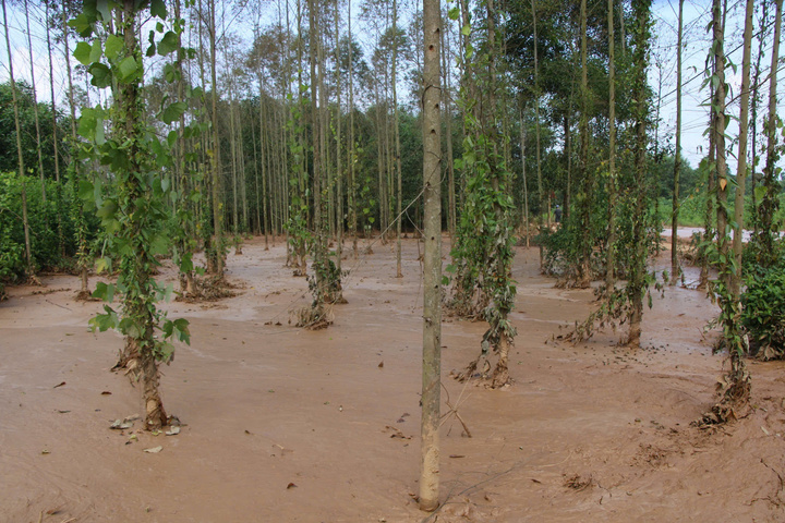 Theo ghi nhận, hồ chứa bùn của nhà máy (công suất 100.000 tấn/năm) được đặt trên sườn đồi. Sau mưa lớn kéo dài, bờ bao bị vỡ, khiến lượng lớn bùn đặc sệt tràn xuống hạ lưu, phủ kín đất canh tác, ao cá và khu dân cư.