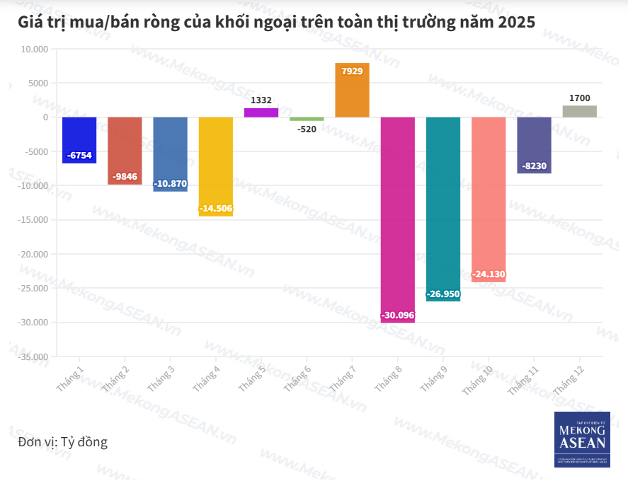 Trong tháng 12/2025, MBB cũng được mua ròng mạnh nhất với giá trị hơn 2.300 tỷ đồng, trong khi VIC dẫn đầu chiều bị bán ròng với giá trị hơn 4.000 tỷ đồng.