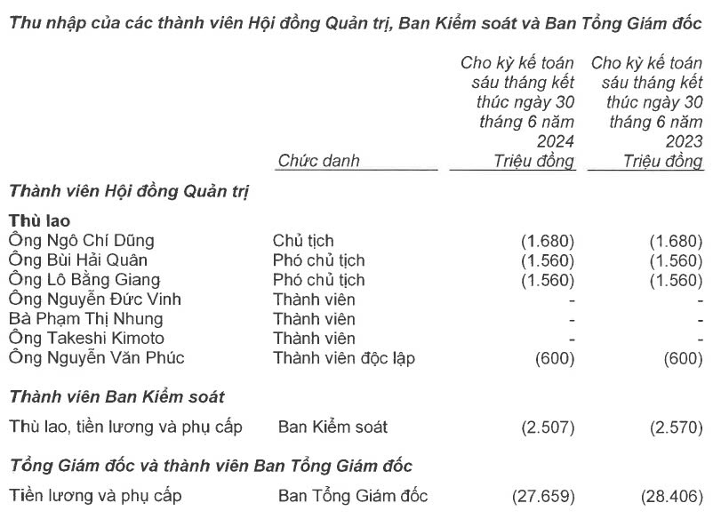 Kết thúc 6 tháng 2024, VPBank đã chi 5,4 tỷ đồng trả thù lao cho các thành viên Hội đồng quản trị (HĐQT), đi ngang so với nửa đầu năm ngoái. Trong đó, ông Ngô Chí Dũng - Chủ tịch HĐQT VPBank nhận được thù lao 1,68 tỷ đồng, tương ứng mỗi tháng nhận 280 triệu đồng. 2 Phó Chủ tịch HĐQT là ông Bùi Hải Quân và ông Lô Bằng Giang mỗi người nhận 1,56 tỷ đồng trong 6 tháng, tương đương mỗi tháng nhận 260 triệu đồng. Ông Nguyễn Văn Phúc, thành viên độc lập HĐQT nhận 600 triệu đồng sau 6 tháng, mỗi tháng nhận 100 triệu đồng.
