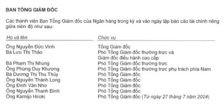 VPBank đã chi 27,7 tỷ đồng trả thù lao cho Tổng Giám đốc và Thành viên Ban Tổng Giám đốc. Trong nửa đầu năm 2024, Ban Tổng Giám đốc bao gồm ông Nguyễn Đức Vinh (Tổng Giám đốc), bà Lưu Thị Thảo (Phó Tổng Giám đốc thường trực và Giám đốc điều hàng cao cấp), bà Phạm Thị Nhung (Phó Tổng Giám đốc thường trực), ông Phùng Duy Khương (Phó Tổng Giám đốc thường trực phụ trách phía Nam), bà Dương Thị Thu Thủy (Phó Tổng Giám đốc), ông Nguyễn Thành Long (Phó Tổng Giám đốc), ông Đinh Văn Nho (Phó Tổng Giám đốc), ông Nguyễn Thanh Bình (Phó Tổng Giám đốc), ông Kamijo Hiroki (Phó Tổng Giám đốc từ ngày 27/7/2024). Như vậy mỗi người sẽ có mức lương, thưởng bình quân khoảng 3,5 tỷ đồng/người, bình quân 583 triệu/ tháng/người.