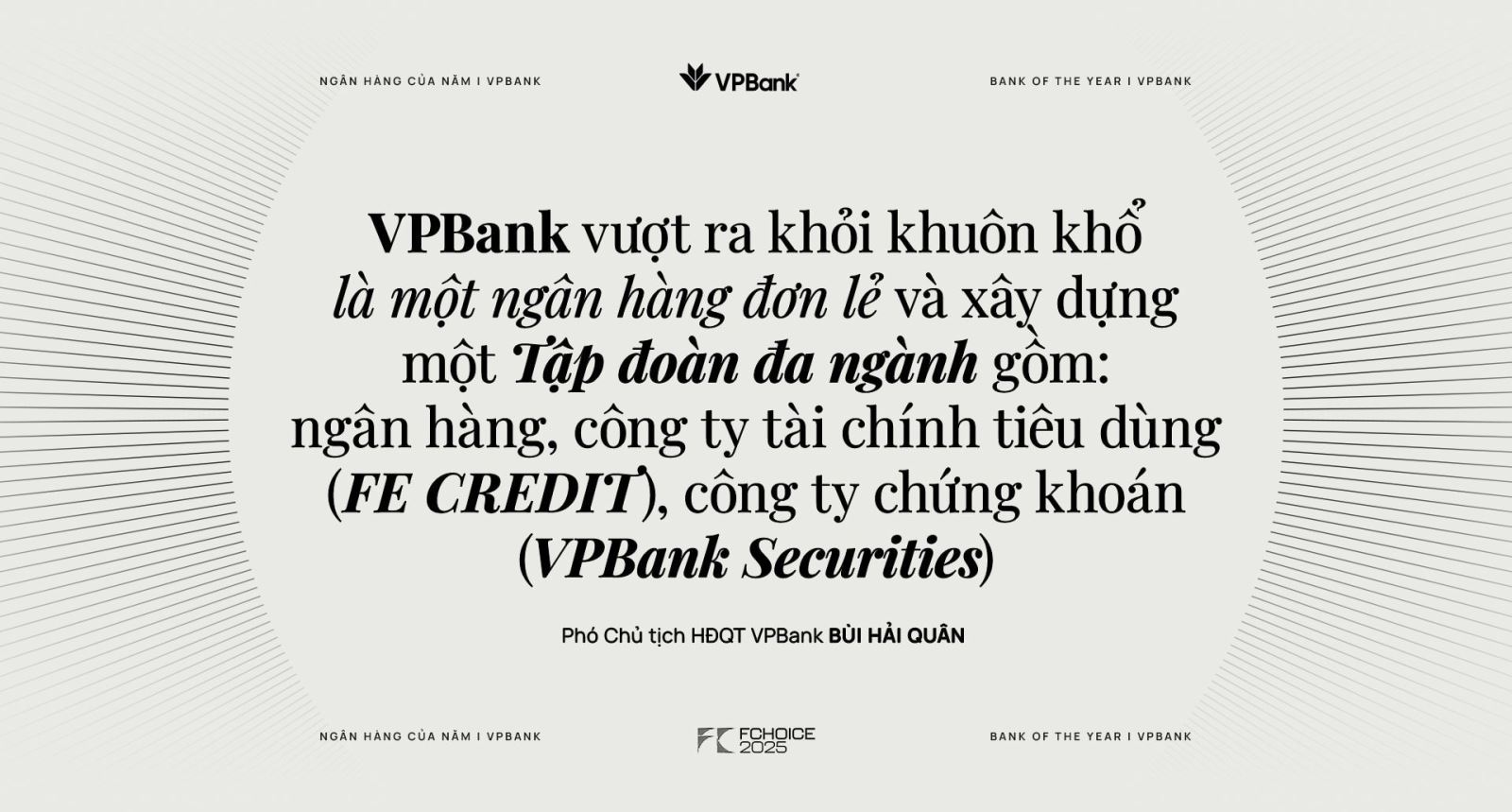 Suốt 32 năm phát triển, VPBank đã nhiều lần trải qua những bước ngoặt chiến lược, nhưng hiếm có giai đoạn nào ghi dấu sự bứt phá như năm 2025, khi ngân hàng vươn mình mạnh mẽ thể hiện rõ hình ảnh của một tập đoàn tài chính tư nhân hàng đầu. VPBank hiện là ngân hàng có phạm vi hoạt động rộng nhất, đa phân khúc, đa nền tảng. Ngân hàng dẫn đầu trong tín dụng tiêu dùng, tài trợ bất động sản, cho vay mua nhà, ôtô, thẻ tín dụng,…