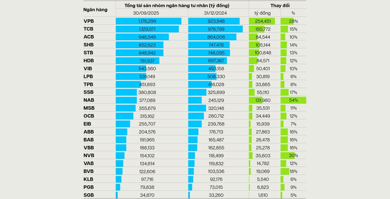 9 tháng đầu năm nay, lợi nhuận trước thuế của VPBank đạt gần 20.400 tỷ đồng, tăng 47% so với cùng kỳ; đồng thời trở thành ngân hàng tư nhân có quy mô tổng tài sản lớn nhất thị trường, gần 1,18 triệu tỷ đồng, cùng tốc độ tăng trưởng dư nợ và tiền gửi khách hàng cũng trong nhóm cao nhất. Song song với kết quả kinh doanh, VPBank còn ghi dấu bằng hai sự kiện chiến lược: tiếp nhận chuyển giao bắt buộc GPBank và hoàn tất thương vụ chào bán cổ phiếu lần đầu ra công chúng (IPO) của VPBankS thu về gần 12.713 tỷ đồng – thương vụ IPO quy mô lớn nhất lịch sử ngành chứng khoán Việt Nam.