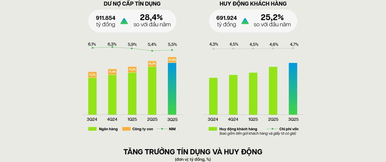 Nhờ nguồn vốn mạnh mẽ này, VPBank đã có thể mở rộng các mảng kinh doanh trọng điểm, điều mà nhiều ngân hàng khác khó làm được. Trong bối cảnh Ngân hàng Nhà nước không còn siết chặt hạn mức tín dụng như những năm trước, VPBank ngay lập tức tận dụng dư địa tăng trưởng và trở thành một trong những ngân hàng có mức tăng tín dụng cao nhất hệ thống. Chỉ trong 9 tháng, tăng trưởng tín dụng hợp nhất đạt 28,4%, đưa quy mô dư nợ lên gần 912.000 tỷ đồng. Không thể đạt mức tăng như vậy nếu ngân hàng không sở hữu nền tảng vốn lớn để hấp thụ rủi ro, hỗ trợ tăng trưởng và đảm bảo tỷ lệ an toàn.