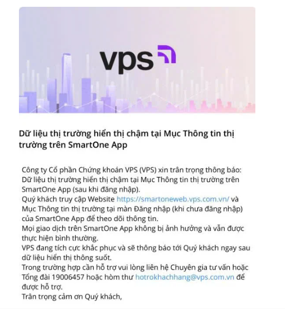 Trong thông báo sáng ngày 16/1 đến với các khách hàng và nhà đầu tư, Công ty cổ phần chứng khoán VPS (VPS) nói rằng, dữ liệu thị trường hiển thị chậm tại Mục thông tin thị trường trên ứng dụng SmartOne (sau khi đăng nhập).
