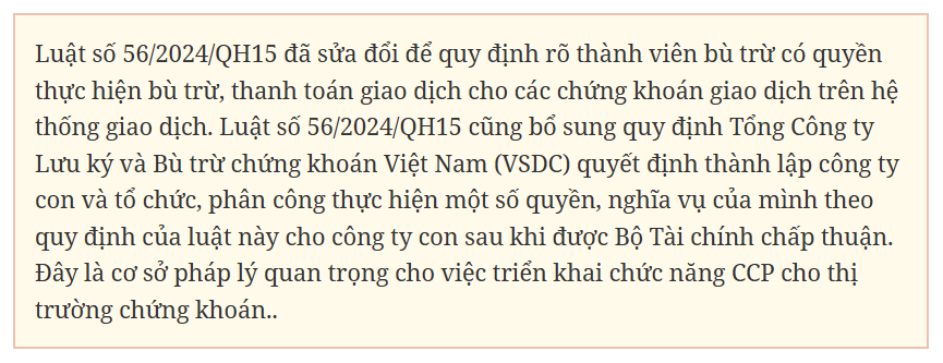 Một nhiệm vụ mang tính nền tảng khác là xây dựng cơ chế bù trừ đối tác trung tâm (CCP), đã được quy định tại Luật Chứng khoán 2019 và Luật số 56/2024/QH15. Theo kế hoạch, VSDC sẽ thành lập công ty con độc lập đảm nhận chức năng CCP, đóng vai trò là bên mua của mọi bên bán và bên bán của mọi bên mua trong giao dịch chứng khoán.