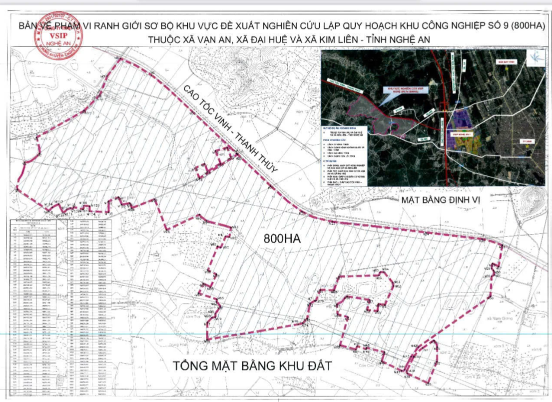 Ranh giới sơ bộ khu vực đề xuất nghiên cứu lập quy hoạch khu công nghiệp số 9 của Công ty TNHH VSIP Nghệ An
